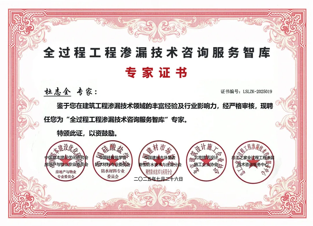 會上成立了“全過程工程滲漏技術(shù)咨詢服務(wù)智庫”,貝瑞斯總經(jīng)理杜志全,技術(shù)總工張廣國受聘為“全過程工程滲漏技術(shù)咨詢服務(wù)智庫”專家,并頒發(fā)證書。